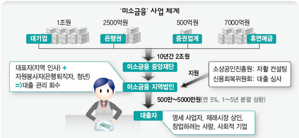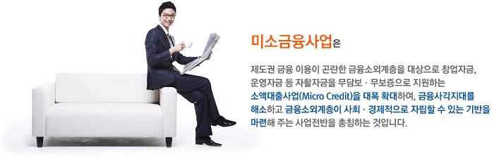 친서민 금융지원제도로 제도권 금융회사를 이용할 수 없는 사람들을 대상으로 창업 및 운영자금등을 무담보ㆍ무보증으로 지원하는 소액대출사업(Microcredit)으로 창업시 사업 타당성 분석, 경영컨설팅 지원, 사후 관리 등의 서비스를 제공합니다. 금융 소외계층이 사회 경제적으로 자립할 수 있는 기반을 마련해주기 위한 자활지원사업입니다. 창업을 하고 싶은데 자금조달할 방법이 마땅치 않은 경우 미소금융이 좋은 대안이 될 수 있습니다. 연 4.5% 금리로 최대 7천만원까지 대출 가능한 상품입니다. 햇살론은 최대 5천만원인데 그보다 더 많은 자금을 더 저렴한 금리로 받을 수 있습니다. 2009년 12월부터 기업 및 은행계 미소금융재단이 설립되어 지원되기 시작했습니다.