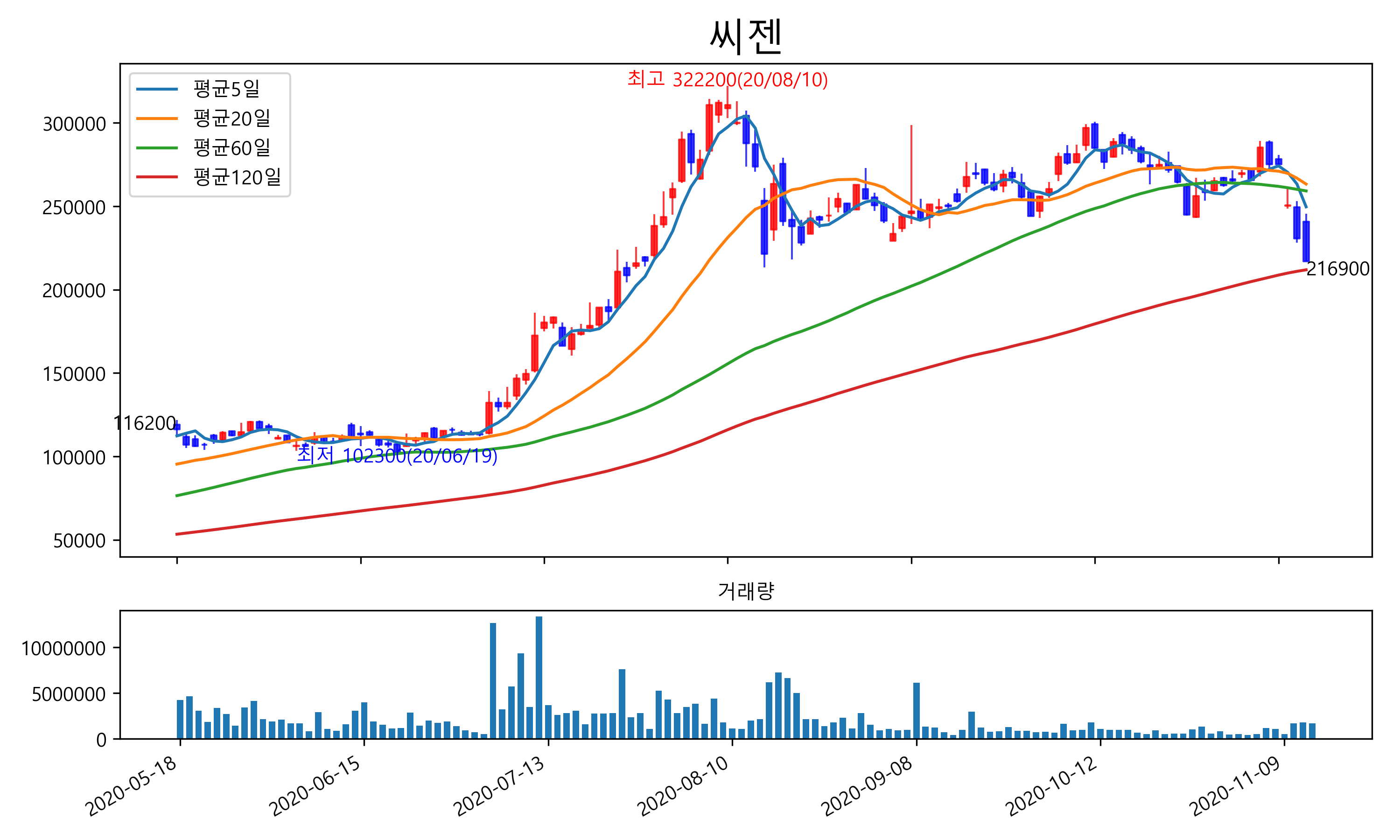 최근 6개월간 캔들차트 및 이동평균선입니다.