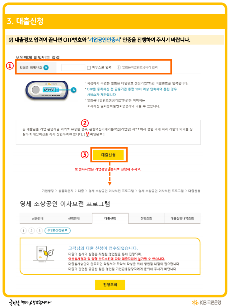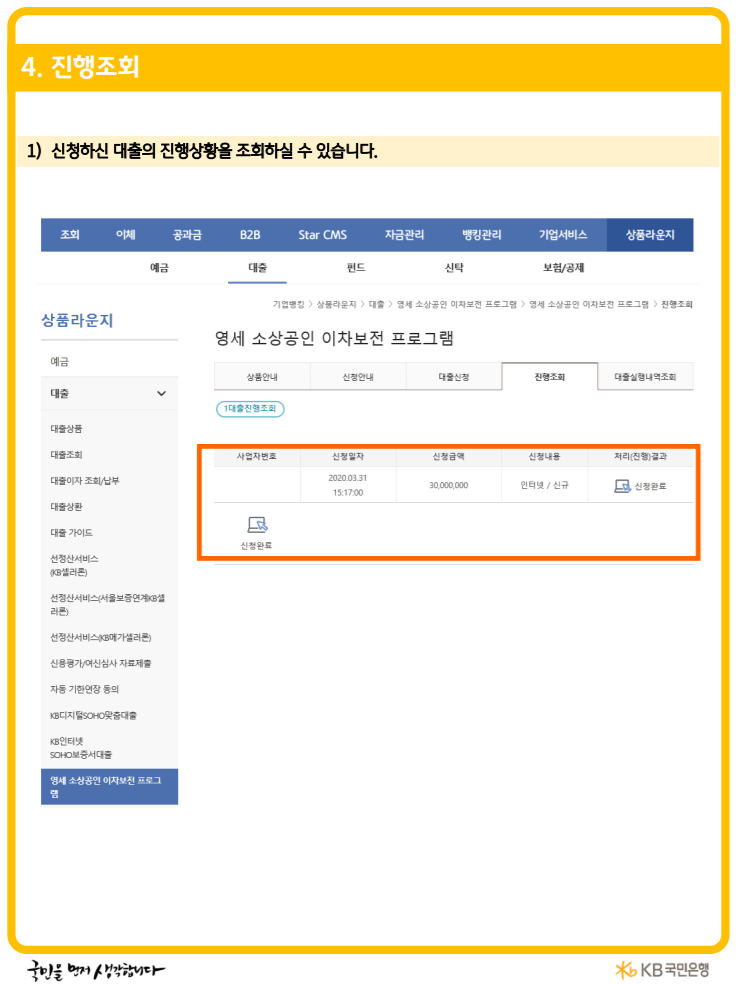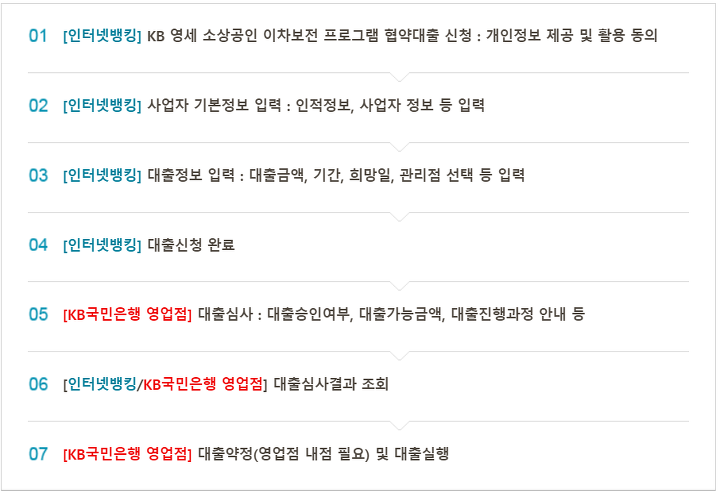 인터넷 신청절차입니다. 이차보전대출은 2차 대출보다 소진률이 높아 빨리 신청하지 않으면 마감될 수 있습니다. 1차 프로그램으로 같이 나왔던 기업은행 초저금리 대출과 소진공 경영안정자금은 자금이 소진되어 마감되었습니다. 고신용자이면서 조금 더 큰 금액이 필요한 경우 이차보전대출을 신청하는 것이 좋습니다.