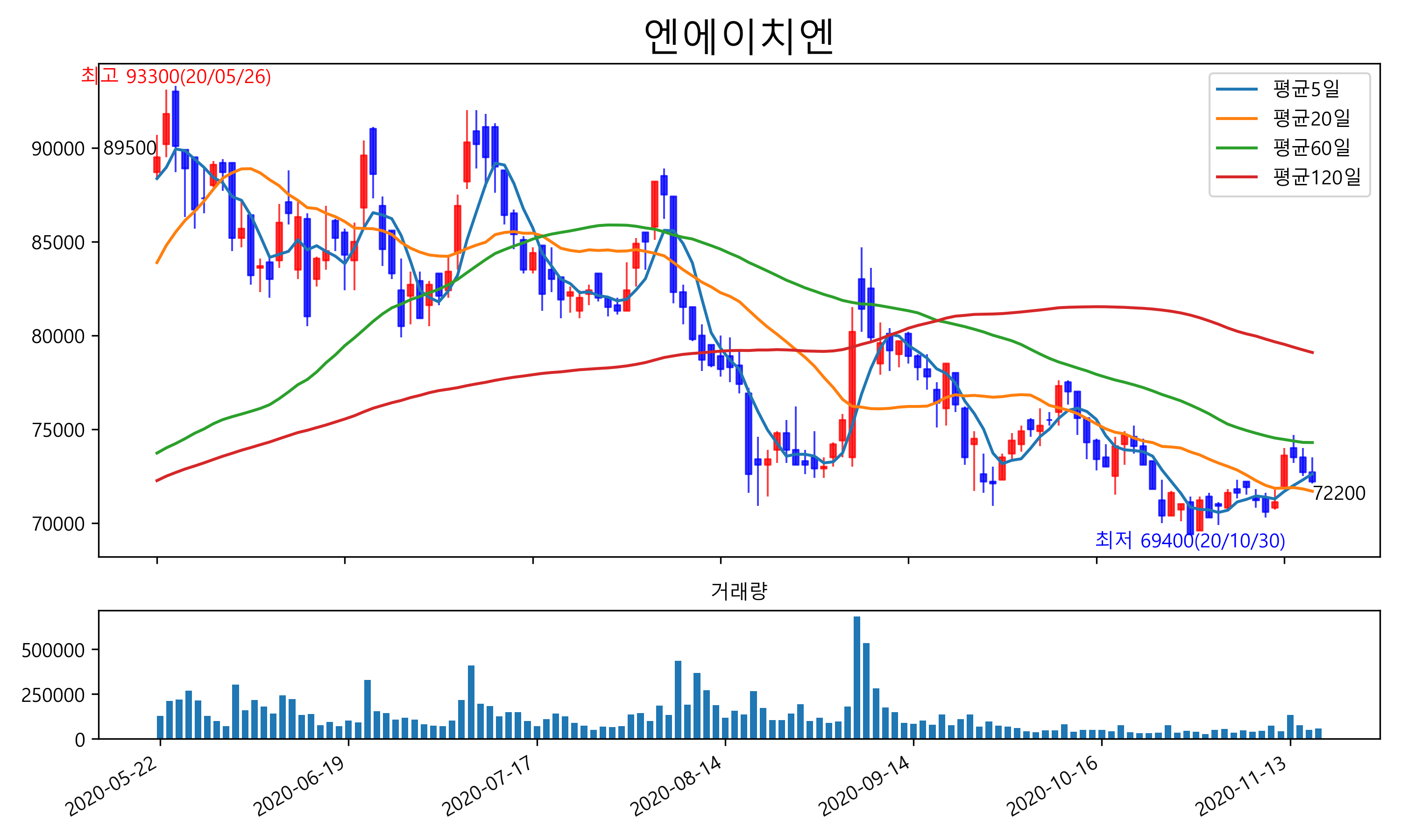 그래프로 보겠습니다. 빨간색 선이 엔에이치엔의 현재 주가입니다.