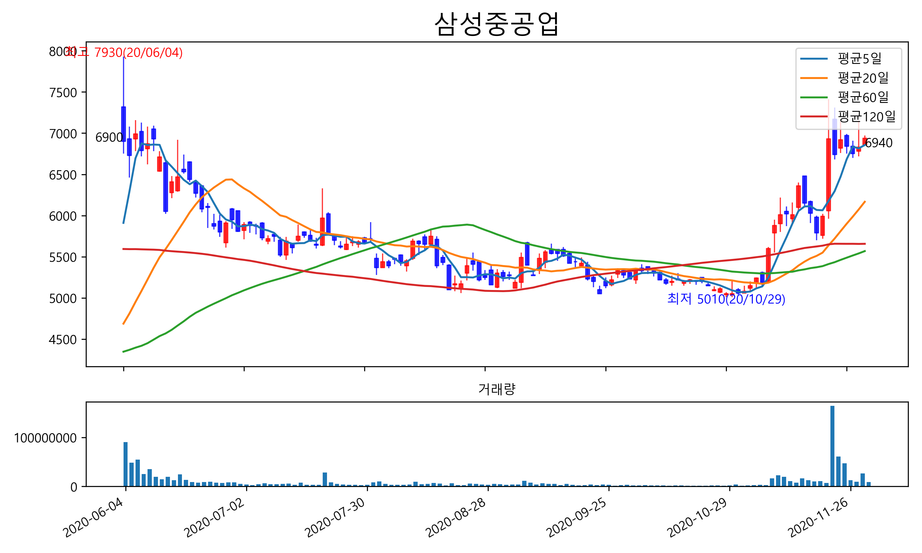 최근 6개월간 캔들차트 및 이동평균선입니다.