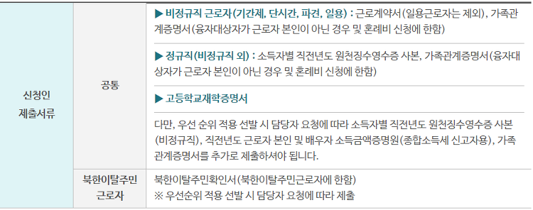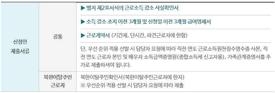 - 평균 소득이 3인 가구 기준 중위소득 3분의 2 ('20년 259만원) 이하인 근로자 (비정규직 근로자는 소득 요건 적용하지 않음) - 신청일 현재 소속 사업장에 3개월 이상 근로 중(단, 일용근로자는 신청일 이전 90일 이내에 고용보험법 시행규칙 별지 제7호서식의 고용보험 근로내용 확인신고서에 따른 근로일수가 45일 이상인 경우) |