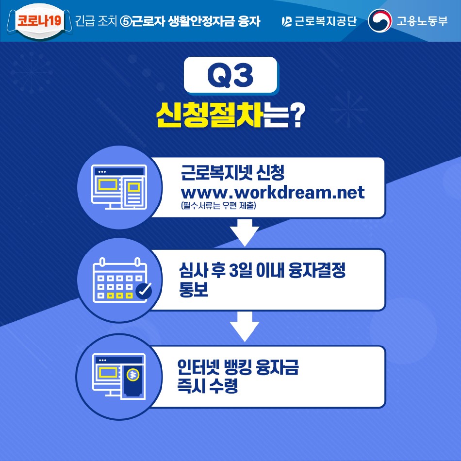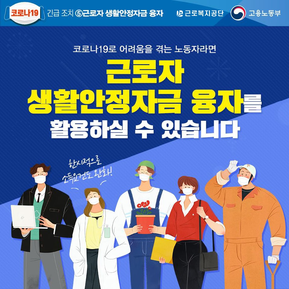 코로나19의 전세계 창궐로 인해 많은 사람들이 어려움을 겪고 있습니다. 일거리가 없어서 직장에서 무급휴직에 들어가거나 해고된 사람도 있으며, 도산하는 소상공인·자영업자들도 속출하고 있습니다. 생활안정자금대출은 저소득 근로자 본인 및 부양가족의 혼례, 장례, 질병 등 예기치 못한 사유 발생시 생활안정자금과 임금체불근로자에게 생계비를 융자함으로써 해당 근로자의 근로의욕 고취 및 생활안정에 기여하는 정책자금인데 코로나19로 인해 소득이 급감한 사람들에게도 지원합니다. 올해 7월 31일까지는 조건이 완화되어 월소득 388만원 이하인 사람도 대출받을 수 있게 됩니다. 생활안정자금 대출에 대해 알아보겠습니다.