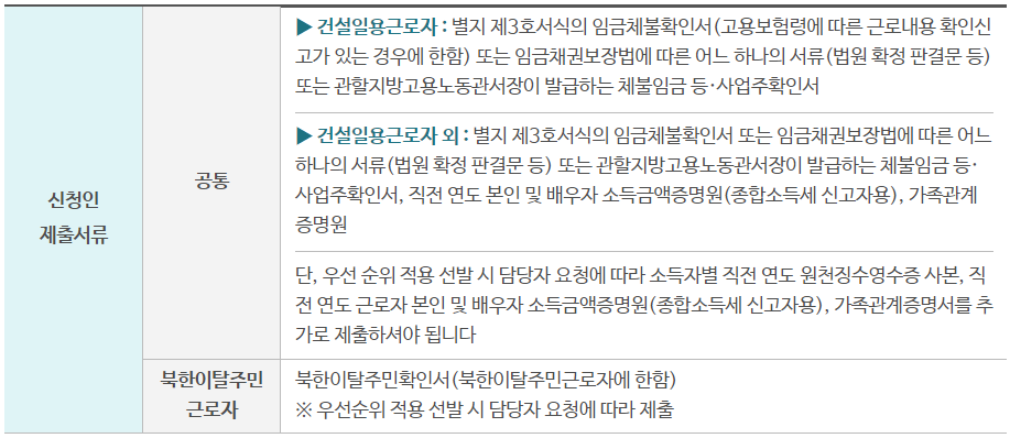 - 가동 중(휴업 포함) 임금체불사업장에 재직 중(건설일용근로자는 신청일 이전 180일 이내에 고용보험 시행규칙 별지 제7호 서식의 고용보험 근로 내용 확인신고서에 따른 근로일수가 30일 이상인 경우) 사유 진행 중 또는 사유 종료일로부터 10일 이내 - 신청일 이전 1년 동안 1개월분(건설일용근로자는 전년 통계청 건설업임금실태조사, 개별직종노임단가」중 하반기 보통 인부 노임 단가의 5일분에 해당하는 금액) 이상 임금이 체불 - 연간소득액(배우자 소득 합산)이 4인가구 기준 중위소득('20년 5,700만원)이하인 근로자. 단, 건설일용근로자는 소득요건 미적용 |