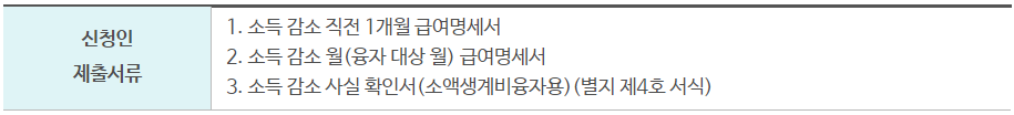 - 개인 사정으로 인한 휴직, 계절 사업 등 소속된 사업장의 사업구조상의 이유로 소득이 감소함에 따라 생활유지에 드는 비용으로 융자대상 월 소득이 직전 달의 월 소득에 비하여 30% 이상 감소한 경우