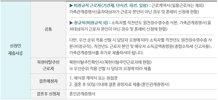 융자 신청일 현재 소속 사업장에 3개월 이상 근로중(다만, 일용근로자는 신청일 이전 90일 이내에 고용보험법 시행규칙 별지 7호 서식의 고용보험 근로내용 확인신고서에 따른 근로일수가 45일 이상인 경우)인 월평균 소득 259만원 이하일 것. 다만, 비정규직 근로자는 소득요건을 적용하지 않음 (’20. 7. 31.까지 한시적으로 정규직 월평균소득 388만원 이하, 비정규직·특수형태근로종사자 소득요건 미적용)