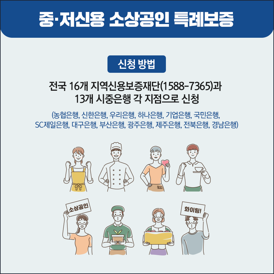전국 16개 지역신용보증재단(1588-7365) 및 13개 시중은행 각 지점