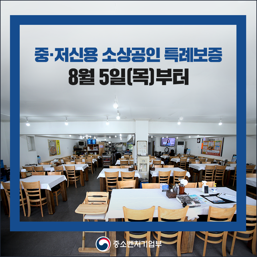 중소벤처기업부는 코로나19 장기화로 인해 매출과 신용이 하락한 소상공인에 대한 긴급 금융지원을 위해 1조원 규모의 ‘중·저신용 소상공인 특례보증’을 8월 5일(목)부터 실시합니다. 지세한 사항을 알려드리겠습니다.